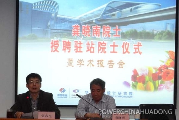 On the morning of May 6, 2013, Hydrochina Huadong held a ceremony to confer the appointment letter of the academicianexpert workstation on Gong Xiaonan, academician of Chinese Academy of Engineering, famous expert in geotechnical engineering, and professor from Zhejiang University. Afterwards, Academician Gong made an academic report. Over 120 technicians witnessed the ceremony and listened to the report. Zhang Chunsheng, president of Hydrochina Huadong, presided over the ceremony and the academic report meeting.